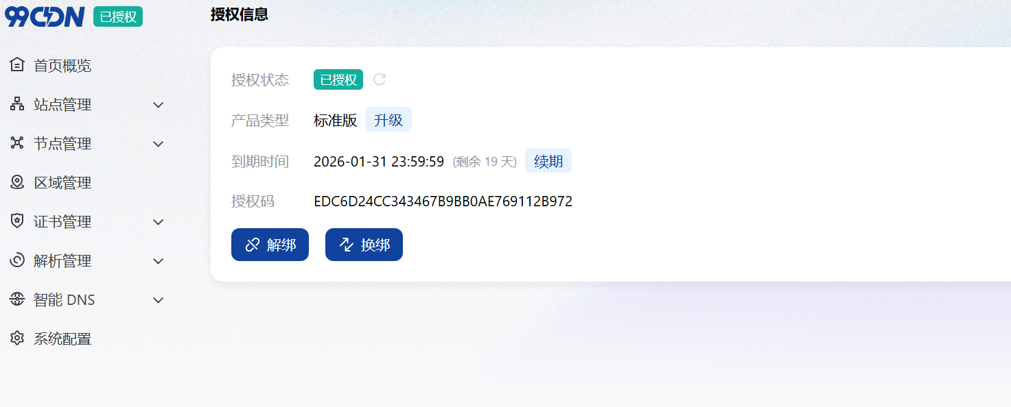 纵观整个操作过程,99CDN 的授权管理逻辑极度纯粹,无论是激活还是解绑均能“一键触达”。其控制面板布局清晰、交互直观,即便是初次接触 CDN 的新手,也能在极短的时间内完成从零到一的部署。告别繁琐配置,回归高效运维,这正是 99CDN 的魅力所在。