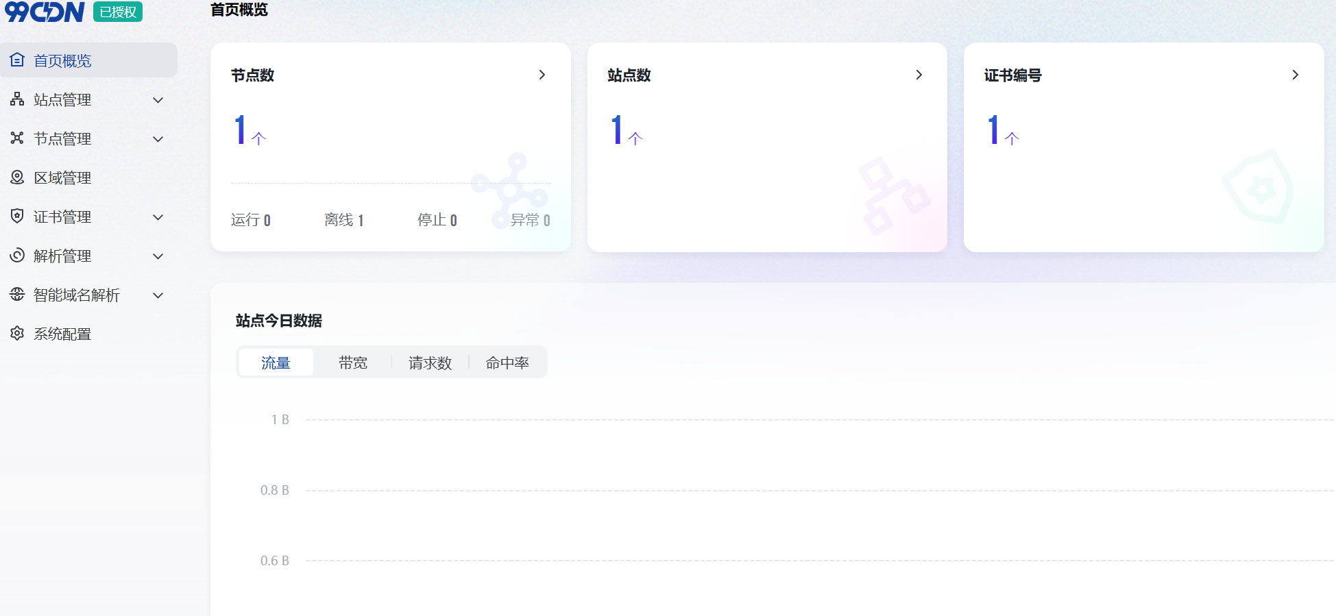 这里可以看见你账号的大概信息,有多少个站点、有多少个节点、有多少个证书以及站点今日数据。