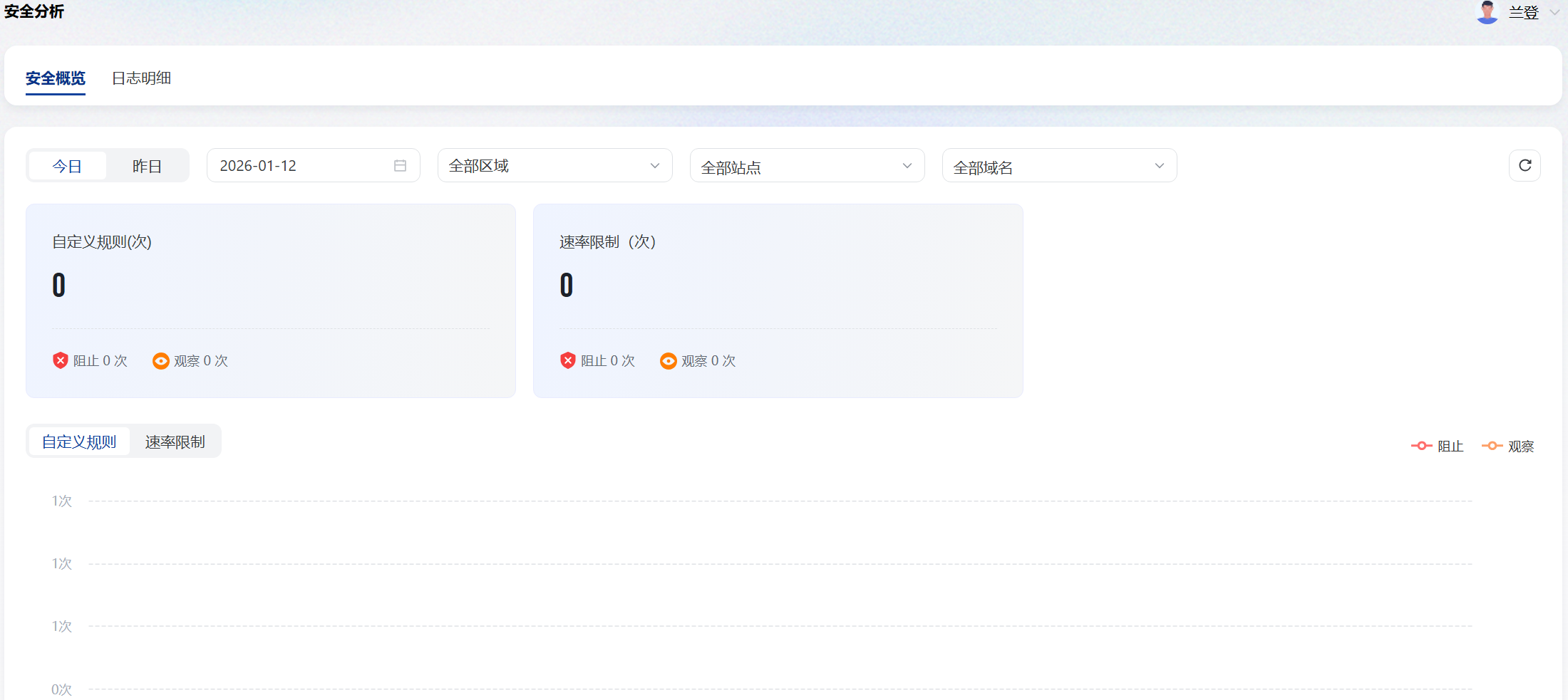 站点安全分析用于展示站点在特定时间内的安全拦截情况,包括白名单、自定义规则、速率限制等安全数据。通过 “安全概览” 与 “日志明细” 两个模块,帮助你快速定位攻击来源、分析恶意请求、排查误拦截等问题。