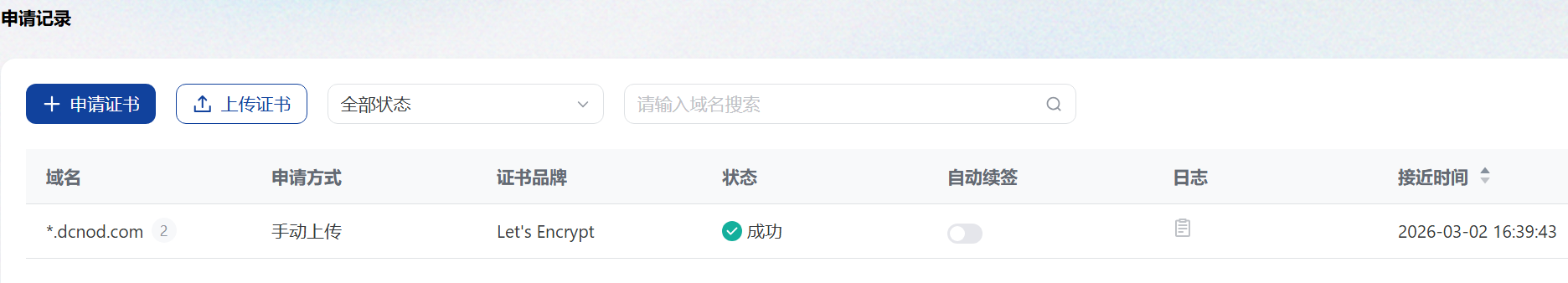 这里可以申请证书和上传已有的证书,同时可以查看证书的状态以及到期的时间。